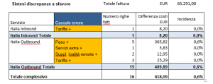L’errore più significativo riguarda il “sovrapprezzo carburante” applicato dal corriere utilizzato per le spedizioni Italia. Il sovrapprezzo carburante è una percentuale che varia settimanalmente in funzione del prezzo del gasolio. L’indice utilizzato, funzione di un moltiplicatore stabilito a contratto e del prezzo del carburante in vigore alla data di decorrenza del contratto, richiede un calcolo relativamente complesso e non permette un rapido controllo da parte del Cliente. L’errore riscontrato dipende appunto da una errata indicizzazione che determina settimana per settimana un supplemento molto superiore a quello previsto. Oltretutto la stessa percentuale è applicata anche ad altre voci non relative al trasporto e quindi espressamente escluse da questo contratto, quali la sponda idraulica e le giacenze. Da notare che noi aggiorniamo sistematicamente i parametri variabili, come il sovraprezzo carburante, i cambi di valuta, ecc., applicandoli alle rispettive voci di costo. Oltre a questa anomalia nelle fatture riscontriamo che a volte sono imputati pesi tassabili superiori a quelli da noi calcolati, specialmente quando sono utilizzate casse di legno, dovuti probabilmente a misure di peso e volume eseguite dal corriere dopo il ritiro, benché il cliente fornisca questi dati corretti al momento del ritiro in formato elettronico. Anche in questo caso sono stati fatti gli opportuni riscontri sulle packing list che il cliente ci ha fornito, pretendendo da parte del corriere la correzione dei dati fatturati e il conseguente storno degli importi.