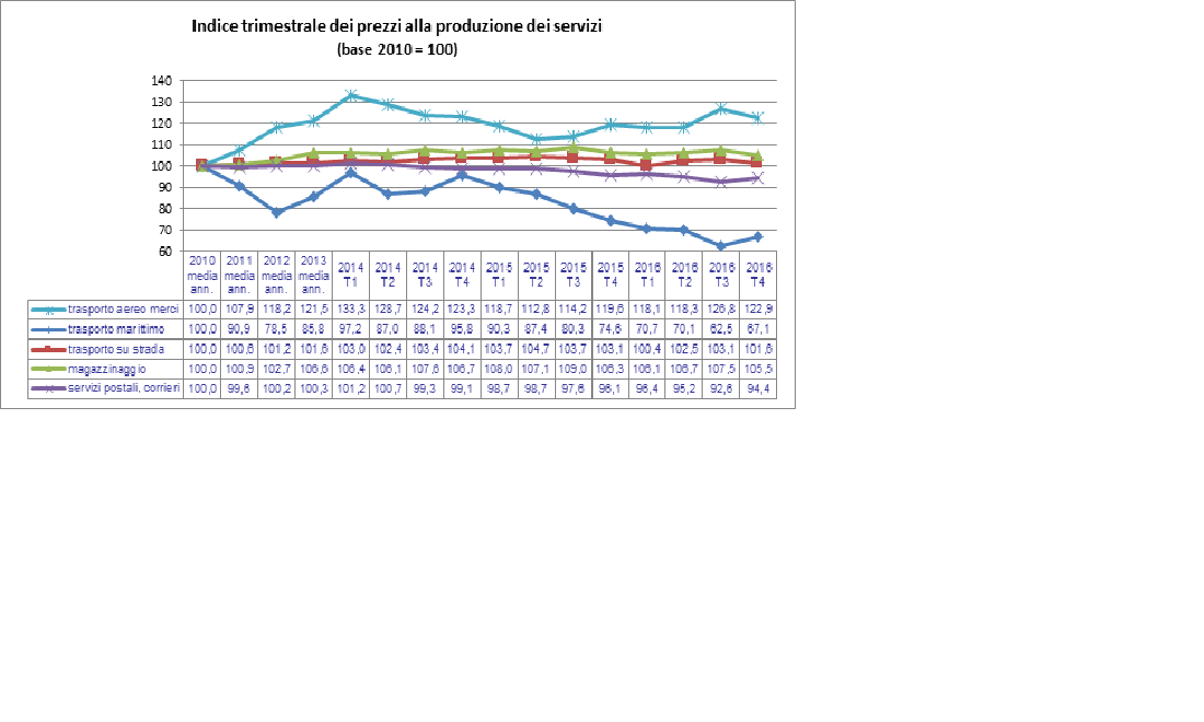 La diminuzione più consistente rispetto al trimestre precedente è quella del trasporto aereo di merci (-3,1%), mentre l’aumento più elevato è quello del trasporto marittimo (+7,4%). Rispetto al corrispondente periodo del 2015 tutti gli indici dei prezzi alla produzione relativi ai servizi di trasporto presentano variazioni negative tranne quello del trasporto aereo di merci (+2,8%) ed il calo più consistente è quello registrato nel trasporto marittimo (-10,1%).